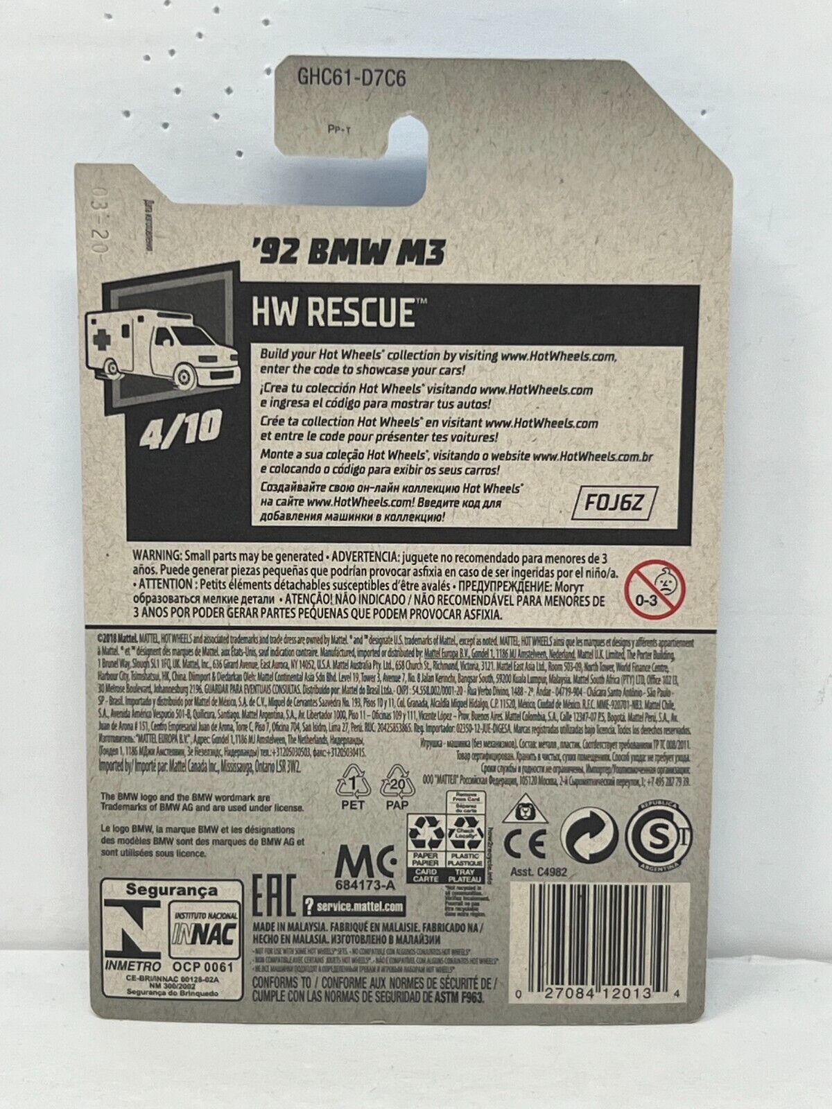 Hot Wheels HW Rescue 1992 BMW M3 European Car 1:64 Diecast V2